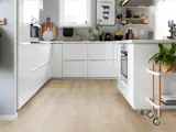 Topplaget består av herdet vinyl som gir en behagelig, myk svikt og en varm, komfortabel overflate. Kjernen er laget av en formstabil HDF-plate, mens baksiden er utstyrt med et dempende lag av kork. I tillegg er klikkskjøtene impregnert for ekstra beskyttelse og økt slitestyrke.