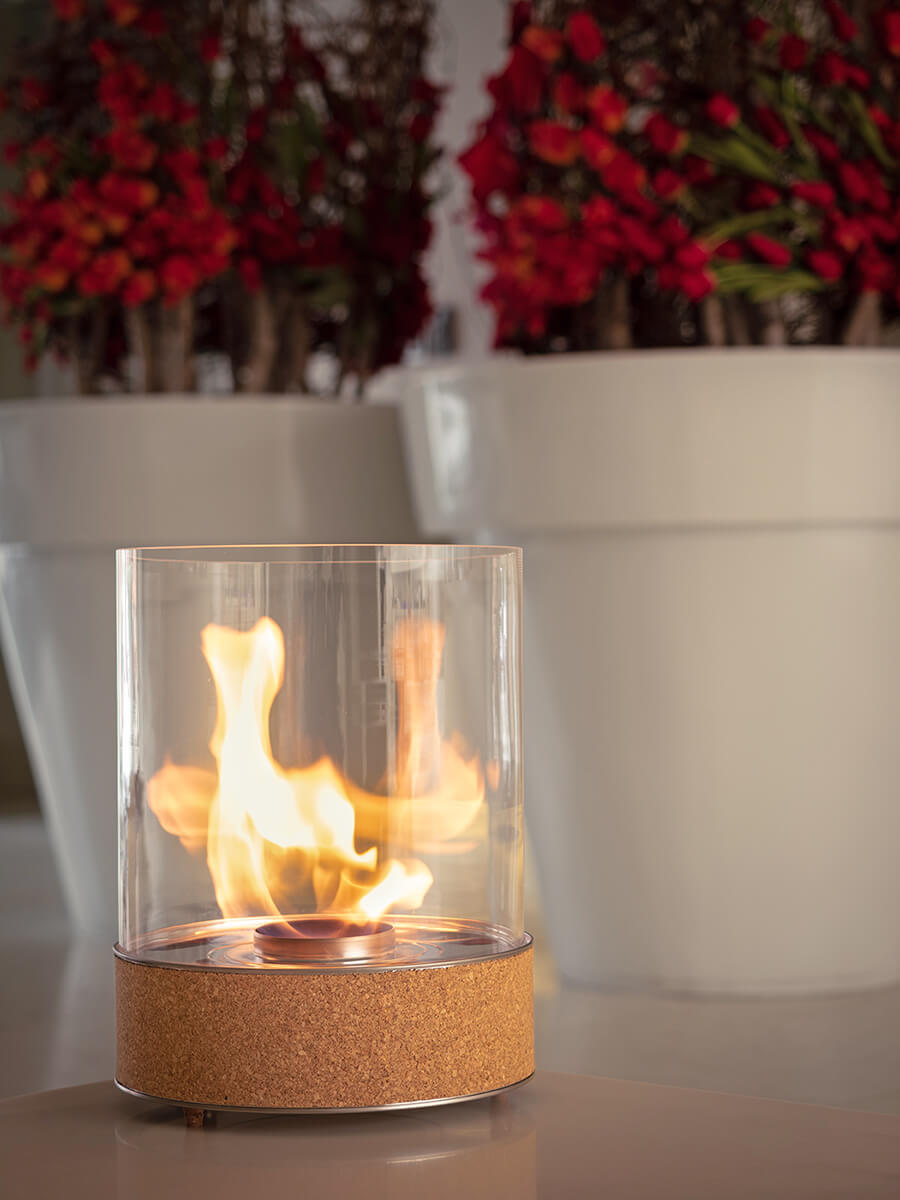 Dancing Flames er en stilfull rund glasspeis med en iøynefallende eikekork-finish som tilfører varme og karakter til ethvert rom. Den omsluttende glassrøret beskytter flammene mot vindkast, noe som gjør den både trygg og praktisk. Med sin kompakte størrelse er denne glasspeisen enkel å flytte og kan brukes både inne og ute. Den rustfrie konstruksjonen sikrer holdbarhet gjennom alle årstider.